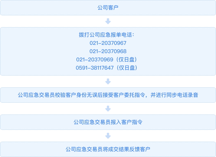 当客户无法正常通过网上交易进行委托时,可以拨打人工应急报单电话进行委托(只接受应急平仓委托)